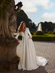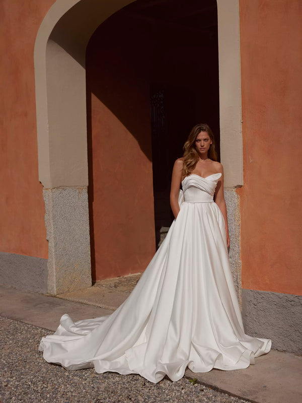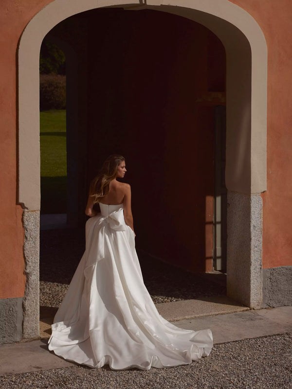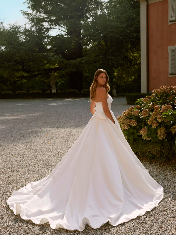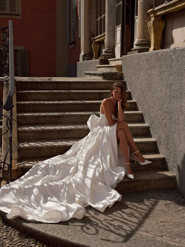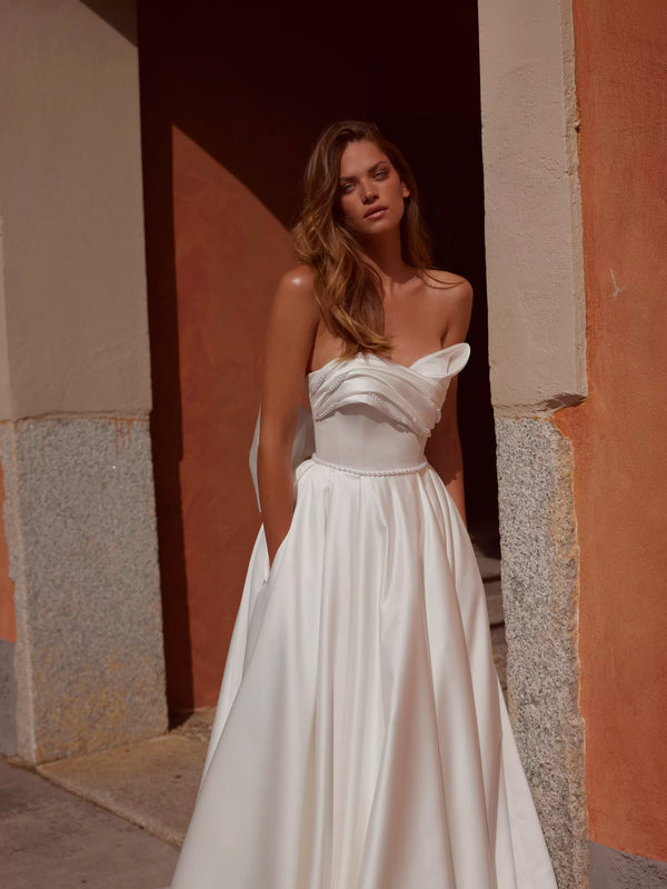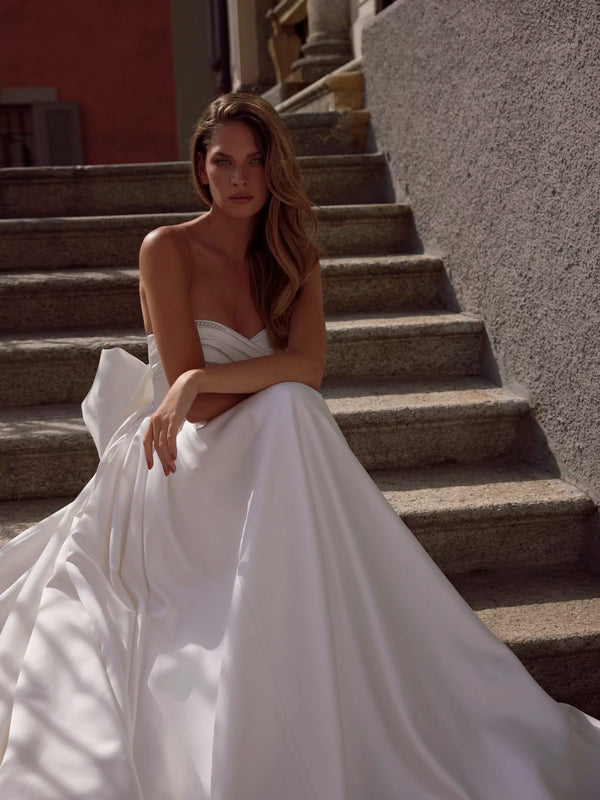 Elegant A-line wedding dress made of satin. The sleeveless style features a sweetheart neckline and draped corset. The dress is decorated with pearls along the drapery and the waistline, flowing into a skirt. In addition to the dress, there is a detachable puffy bow that extends into a cathedral train.