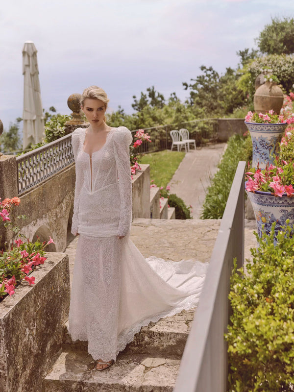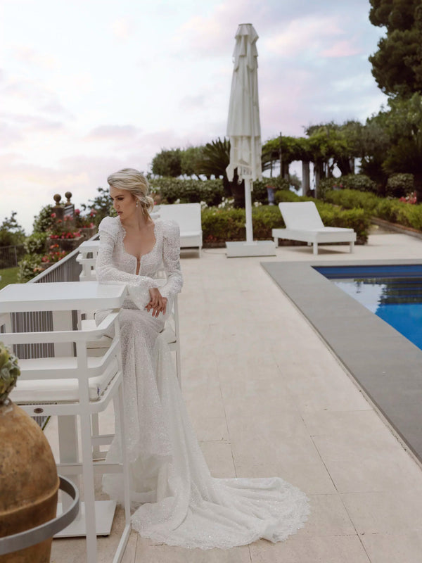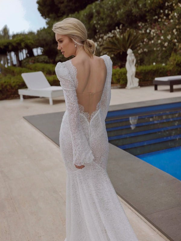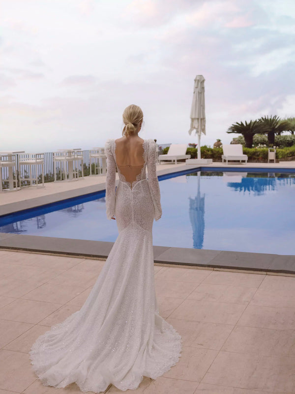 Mermaid dress with sleeves, plunging illusion neckline and open back. Made of delicate lace with beads.