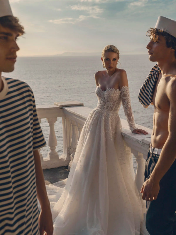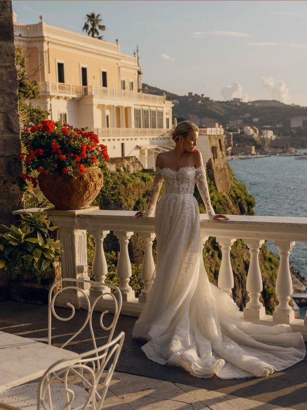 This ballgown wedding dress is a vision of timeless elegance, with sweetheart neckline and off the shoulder long sleeves. Embroidered with lace on the mesh and supplemented with semi catherdal train.