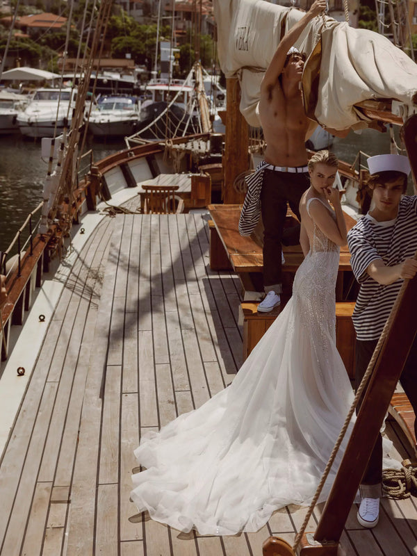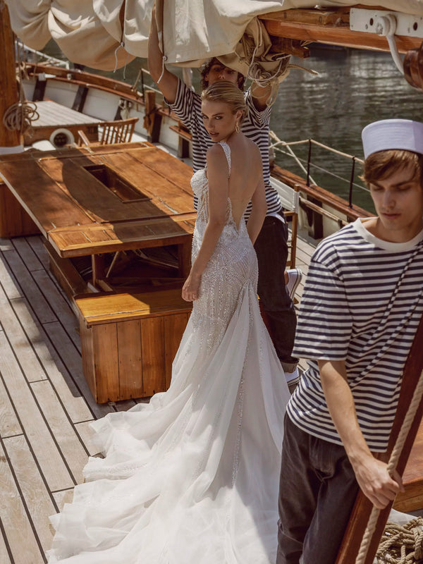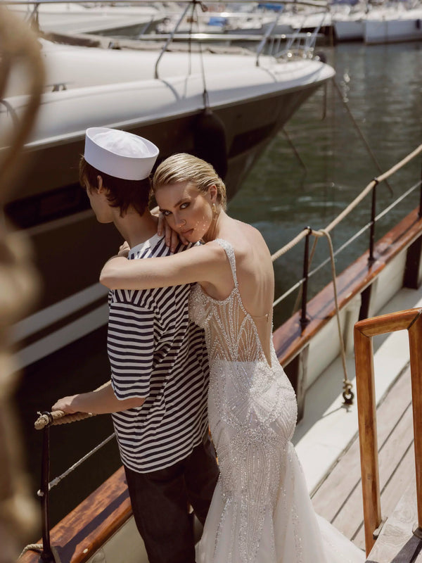 Mermaid dress made of mesh embroidered with beads and sequins is decorated with the illusion of an open back and sides of the dress. The gown is completed with removable embroidered straps.