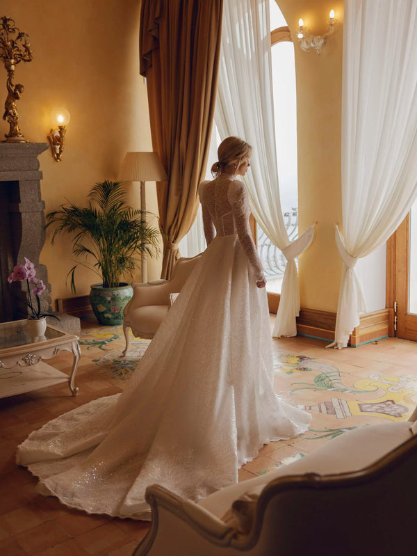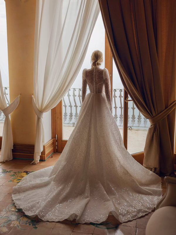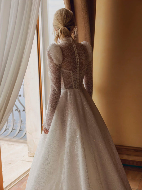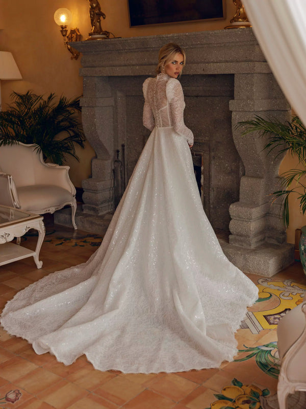 A-line dress with long sleeves and a closed neckline. Made of delicate lace with shimmering sequins.
