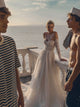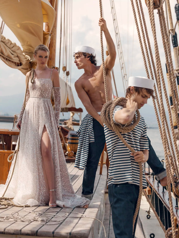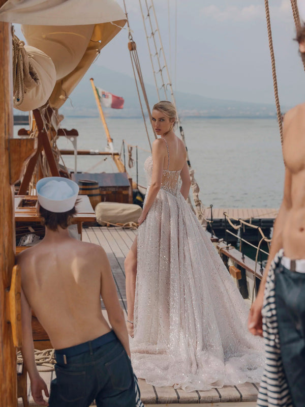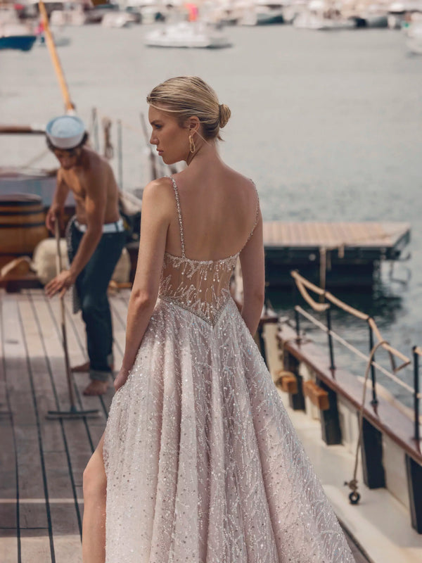 A-line dress with a deep slit on the leg and removable sleeves. Craftedfrom beaded lace. Complemented by the illusion of an open back with embroidery.