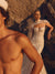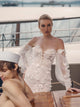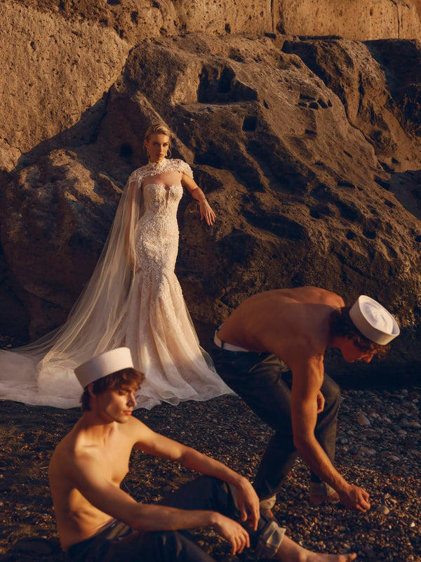 This dress looks like a mermaid emerging from the sea foam. It is hand-embroidered with slightly iridescent lace and complemented by a removable mesh cape decorating the line of the neck and shoulders.