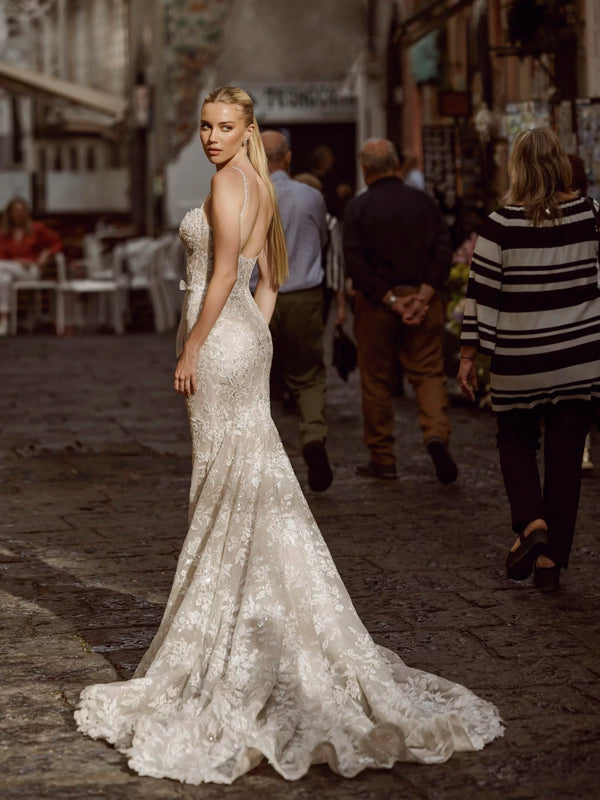 Lace Fit and Flare Dress with shimmering lace and straps.