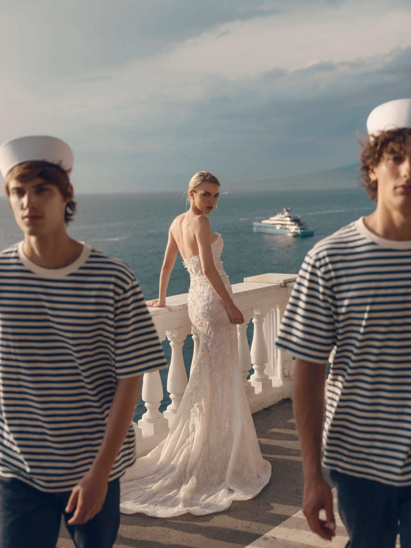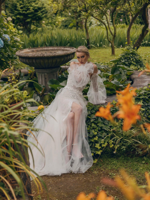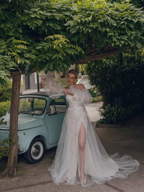 Lace mermaid dress with a deep slit on the leg is complemented by hand embroidery, a removable skirt made of delicate mesh and voluminous detachable sleeves made of lace and mesh.
