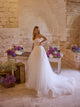 The dress features a mermaid silhouette, made from milk-colored stretch satin with draping over the corset, beneath which lies nude mesh. The mesh is embellished with intricate bead work and rhinestones, extending across the entire corset and long sleeves. The dress is completed with a detachable satin skirt, featuring a slim waistband and a dramatic long train.