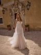 This enchanting princess-style gown in ivory color features a voluminous skirt made of delicate lace and tulle. The bodice is designed with draped tulle over the corset, adding texture and sophistication, while intricate lace embroidery enhances the romantic appeal. The dress also includes removable off-shoulder straps, allowing for a customizable and elegant look.