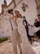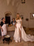 This stunning A-line dress with a satin skirt with elegant pleats and a daring slit creates the perfect balance of sophistication and appeal. The bodice is made of sparkling mesh, giving a subtle glow, and is embellished with intricate embroidered lace, emphasizing the sophisticated elegance of the dress. Wide straps descend from the shoulders and are embroidered with the same lace