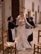 An elegant princess dress, crafted separately with a voluminous milk-colored tulle skirt and a corset with a straight neckline made from delicate lace, embroidered with sequences and beads. The corset gradually flares out towards the hips and features a lace-up detail at the back for an adjustable fit.