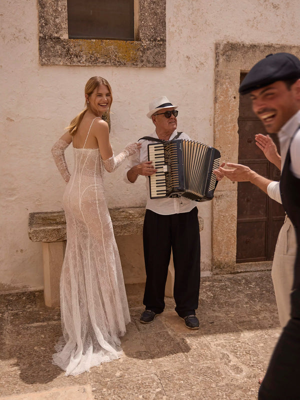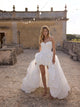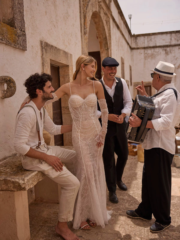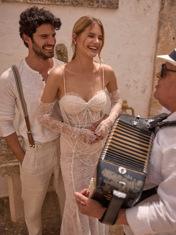 Semi-transparent ivory dress made of delicate Chantilly lace, without corset. The cups of the dress are beautifully decorated with beads that cascade down the dress. Long removable lace sleeves complete the image, giving it elegance and romanticism.