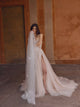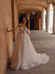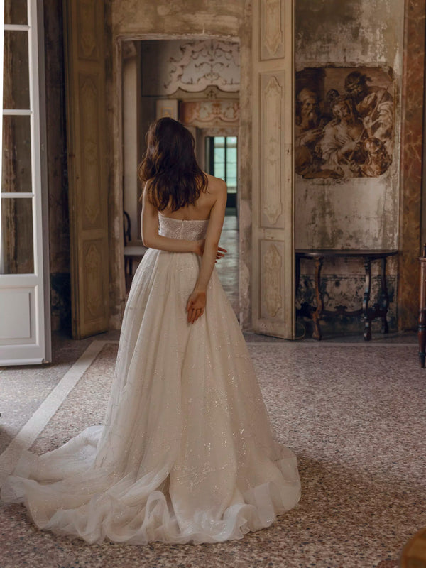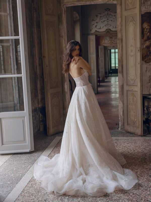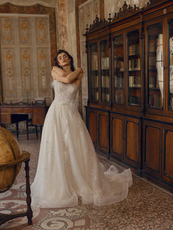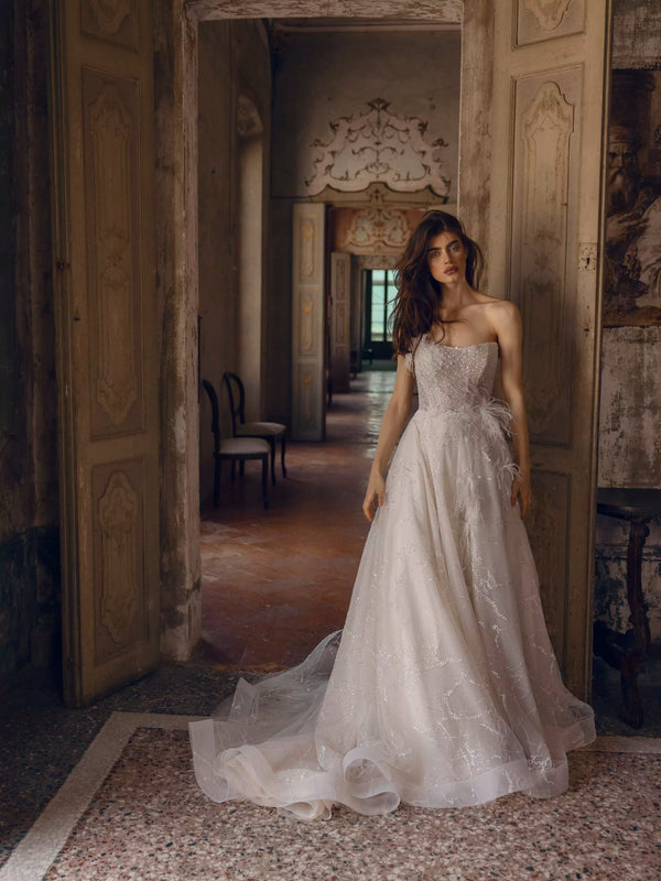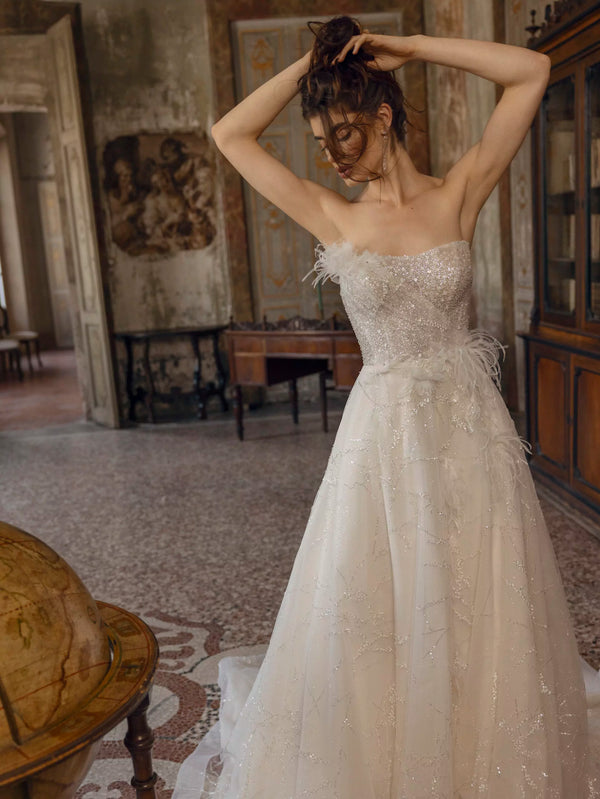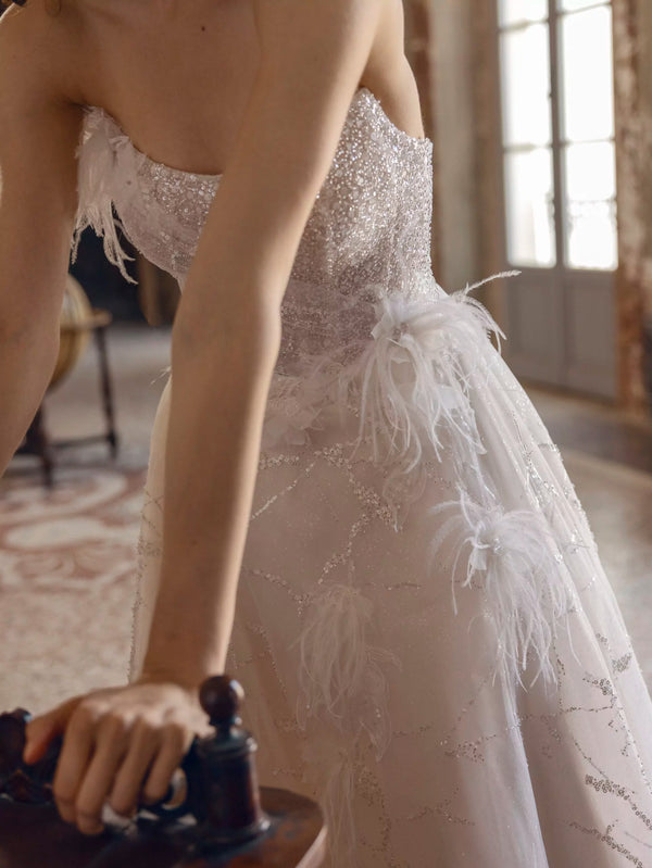 A stylish A-line tulle dress with shimmering patterns, decorated with rhinestones, flowers and feathers creates an incredible look.
