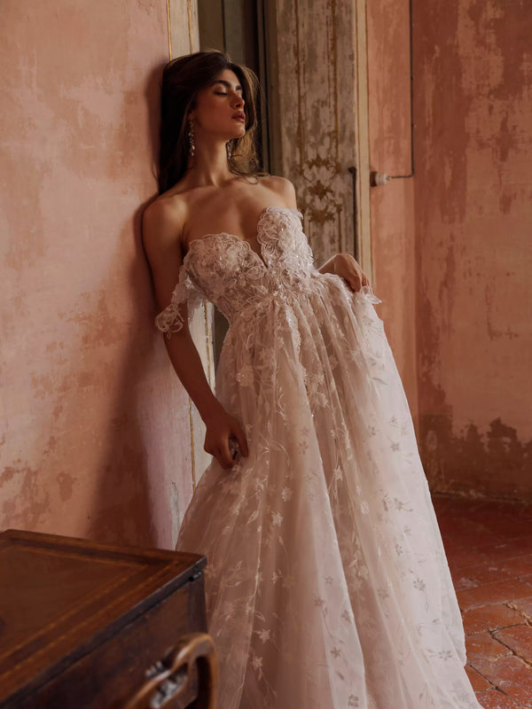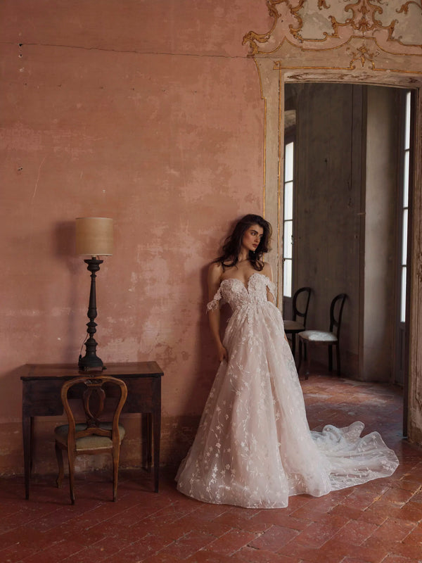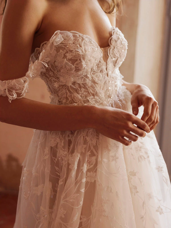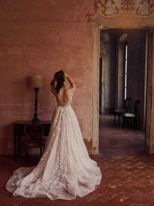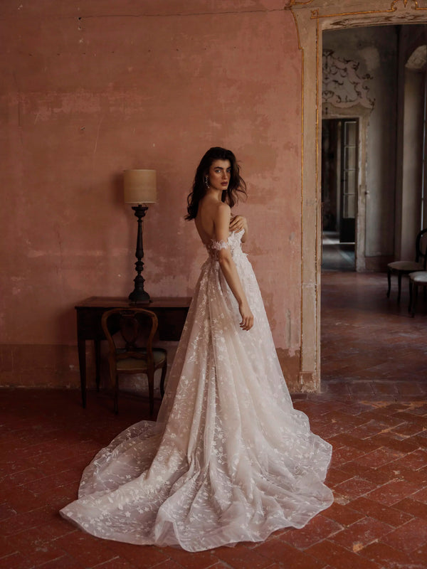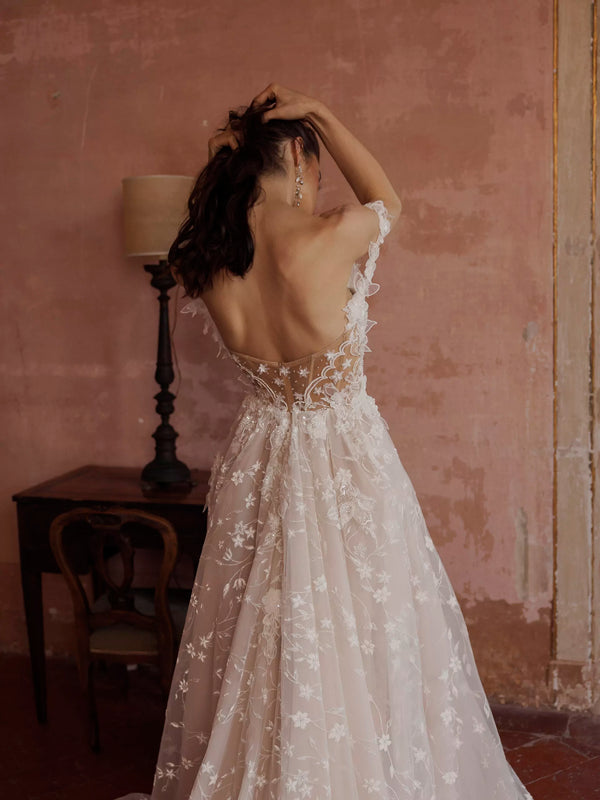 Incredible tulle and lace dress with floral print and dropped straps with added 3D flowers on the corset and Cathedral train.