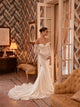 Statement mermaid gown made from luxurious Italian satin, featuring a removable architectural-style embellishment adorned with 3D flowers along the back, cascading into a delicate mesh train. The form-fitting silhouette boasts a sweetheart neckline and a fitted maxi skirt with an elegant train.