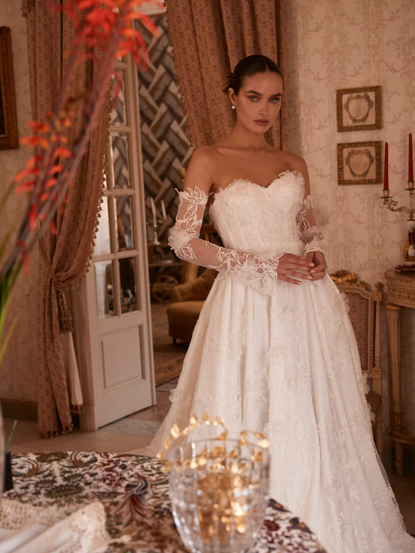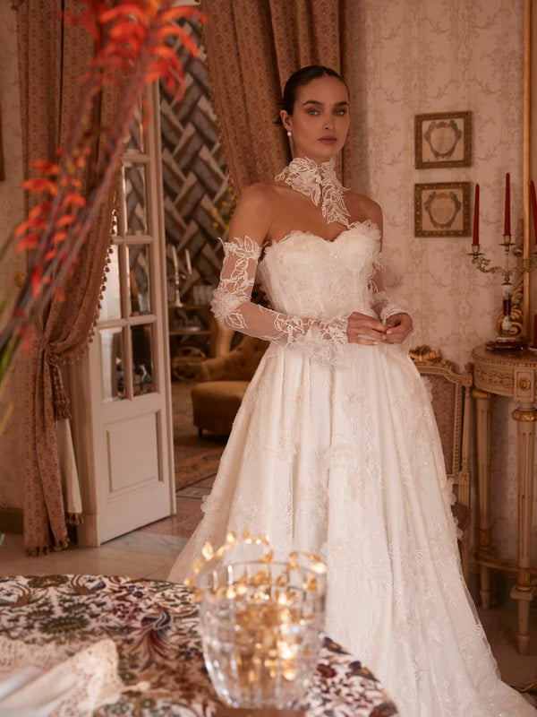 An A-line gown with a sweetheart neckline, crafted from sugar taffeta and lace with 3D appliqués and a zipper back. The dress features removable long sleeves and a detachable lace neck decoration, and is complemented by a royal train.