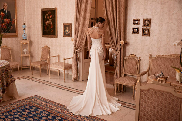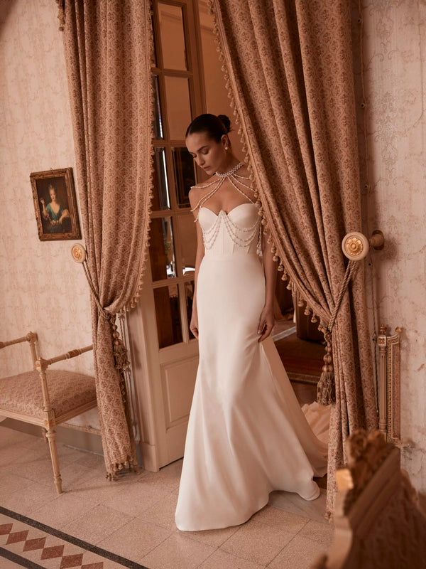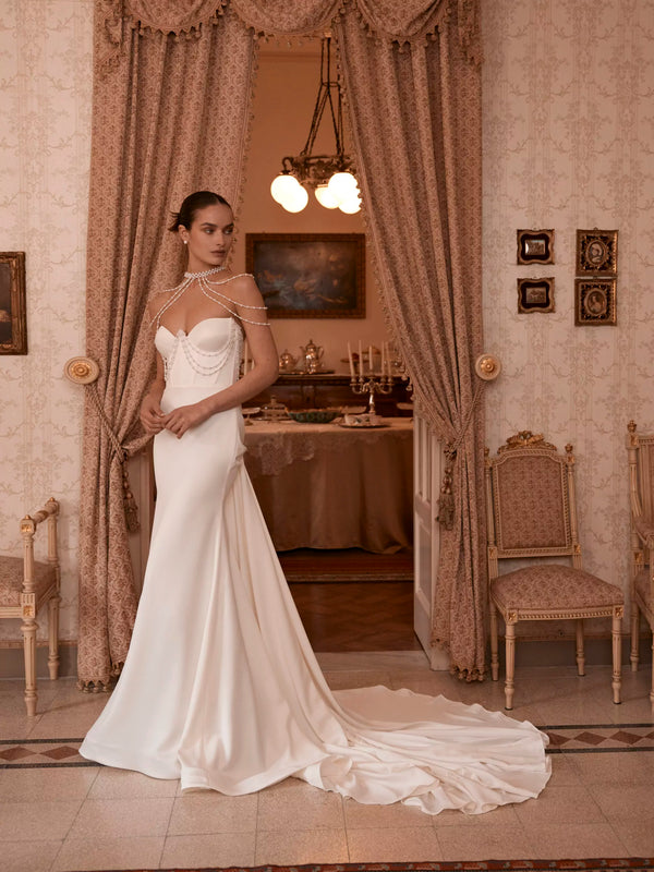 An extraordinary mermaid silhouette gown made of satin, distinguished by its unique corset shape adorned with pearl embellishments that gracefully highlight the bust. The back of the dress features draping that flows into an elegant train. A remarkable decoration that complements the gown is a pearl necklace that cascades over the shoulders, creating an absolutely stunning look.