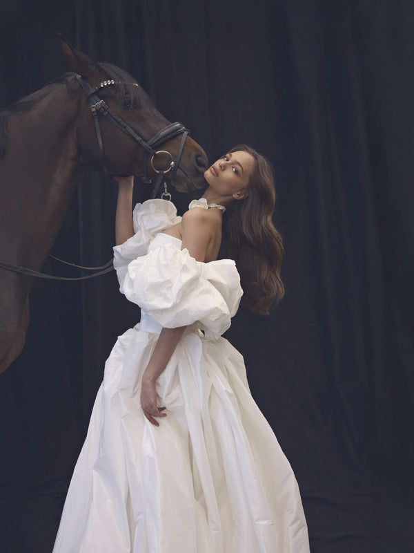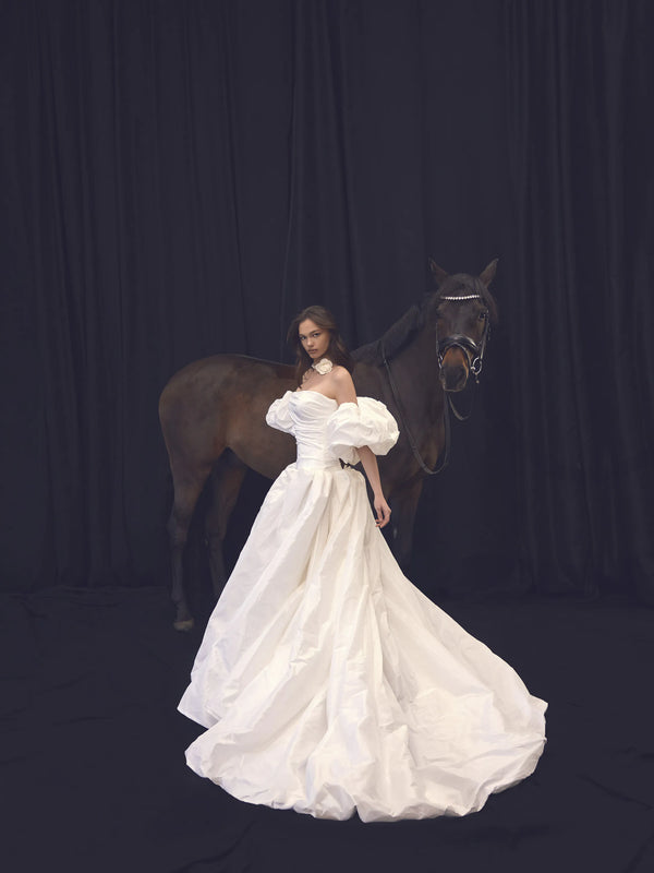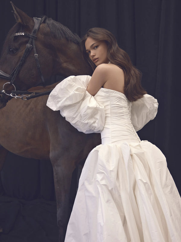 Completing the ensemble are detachable puff sleeves, which add a playful and romantic flair to the overall design.