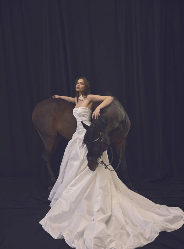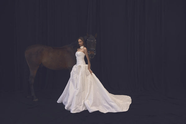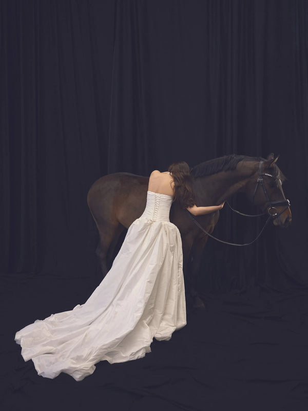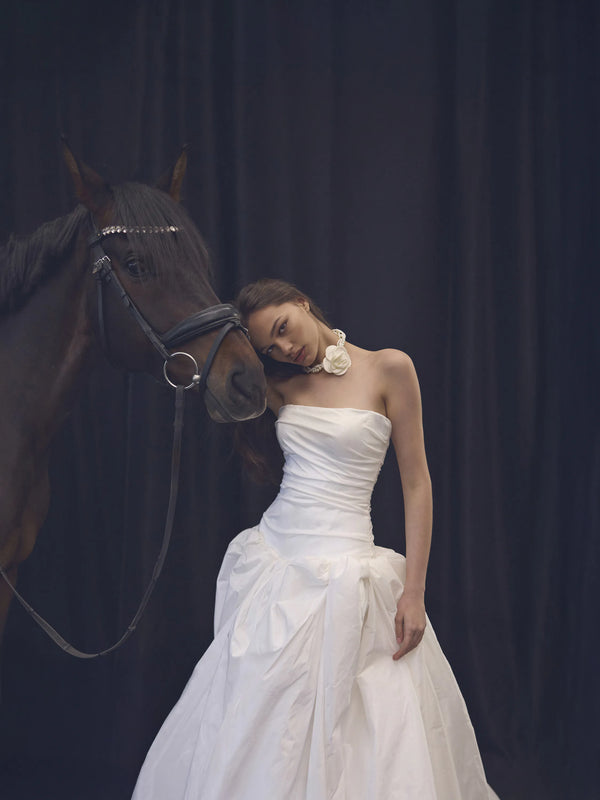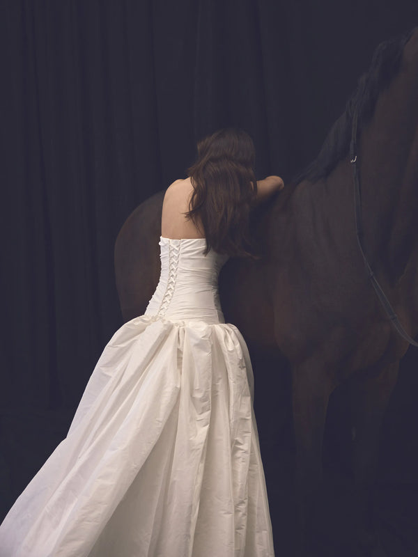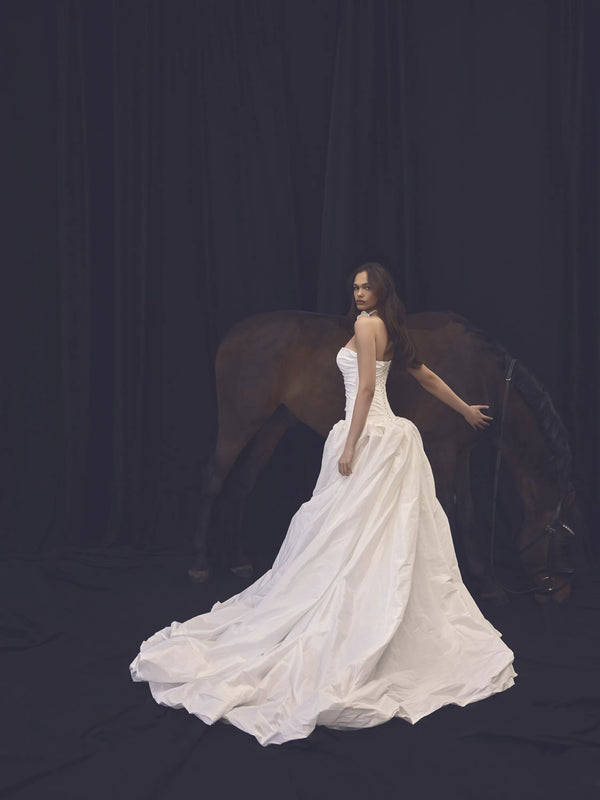 This princess-style gown, crafted from luxurious taffeta, features a low-waisted pleated corset with a straight neckline, creating a graceful and elongated silhouette. The voluminous skirt flows effortlessly from the corset, enhancing the airy and ethereal quality of the dress. At the back, an elegant lace-up detail adds a touch of sophistication and allows for an adjustable fit.