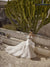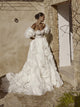 Aceasta rochie de mireasa eleganta in linie A are un decolteu in forma de inima, un design fără umăr si mâneci lungi. Este fabricată din tiul moale si este decorată cu paiete si frunze de organza. Straturile interioare sunt realizate din tiul strălucitor, sporindu-i strălucirea. Aspectul poate fi completat cu un voal lung realizat din același decor.