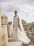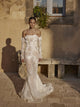 Rochie de mireasa cu țesătură translucida si silueta sirena, cu decolteu adânc in V. Este realizată cu broderie florală din dantela. Caracteristica definitorie a rochiei sunt fundițele care curg pe umeri, creând un efect eteric pe măsură ce coboară grațios.