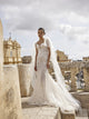 Rochie de mireasa uimitoare cu o silueta sirena care trasează elegant contururile corpului, evazandu-se ușor într-o trena modesta. Designul pe umeri, are mâneci transparente, detașabile pe toată lungimea. Rochia este realizată dintr-o țesătură translucida împodobită cu dantela 3D, mărgele si paiete care captează lumina, dând rochiei o strălucire subtila.